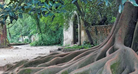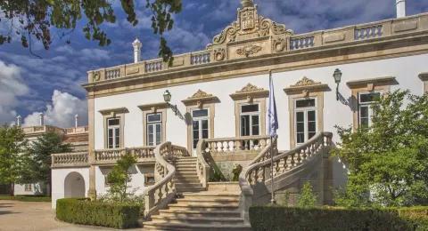 Een lange oprijlaan geeft toegang tot het eeuwenoude Quinta das Lagrimas, een door prachtige tuinen omgeven paleis met lichtgrijze granieten raam- en deurlijsten, karakteristiek voor Midden- en Noord-Portugal.